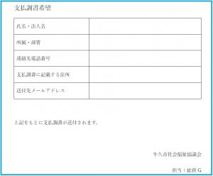 対象は、2025年(令和7年)お支払い分(2025.1.1~2025.12.31)からとなります。 なお、支払調書を必要とされる方には、個別メールにて対応をさせていただきます。 所定の書式(ページ下部の添付資料をダウンロード)に必要事項をご記入のうえ、牛久市社会福祉協議会総務までご送付ください。 メール以外での方法でご希望の方、ご不明な点等がある方、申請から7日経過しても届かない場合は、下記お問合せ先までご連絡ください。 【必要事項】 支払調書を必要とされる方は以下の内容をお知らせください ・氏名、法人名 ・所属、部署 ・支払調書に記載する住所 ・連絡先電話番号 ・送付先メールアドレス 【お問い合わせ先】 〒300-1292 茨城県牛久市中央3-15-1(牛久市役所分庁舎内) 社会福祉法人 牛久市社会福祉協議会 総務担当:大塚・梅田 TEL:029-871-1295 FAX:029-871-1296 e-mail:soumu@ushikushakyo.jp